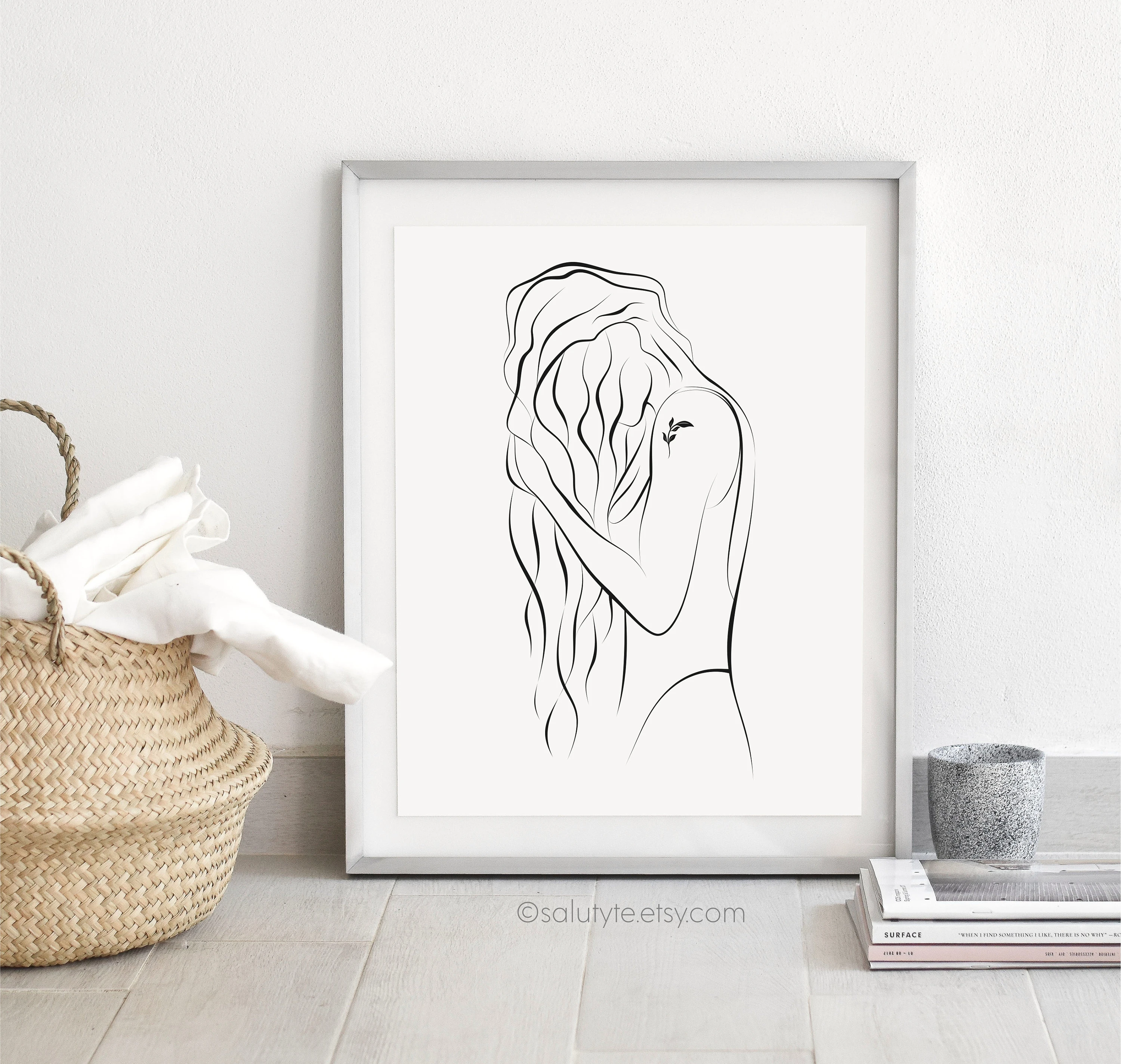 Girl With A Branch Tattoo Woman Line Art Female Figure Drawing Long Hair Print Sexy Line Art Summer Printable Art Wa Painting Calligraphy Aliexpress
