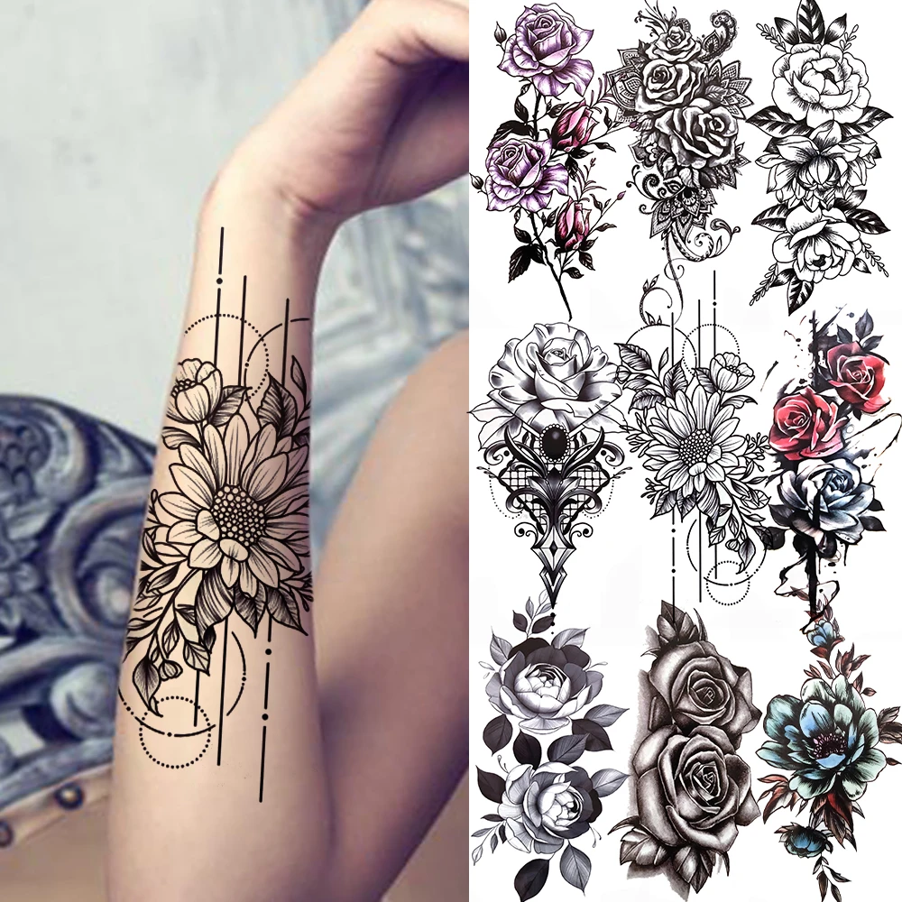 Beautiful Daisy Line Art Temporary Tattoo For Women Adult Black Rose Peony Fake Flower Tattoo Sticker Bouquet Makeup Tools Tatoo Temporary Tattoos Aliexpress